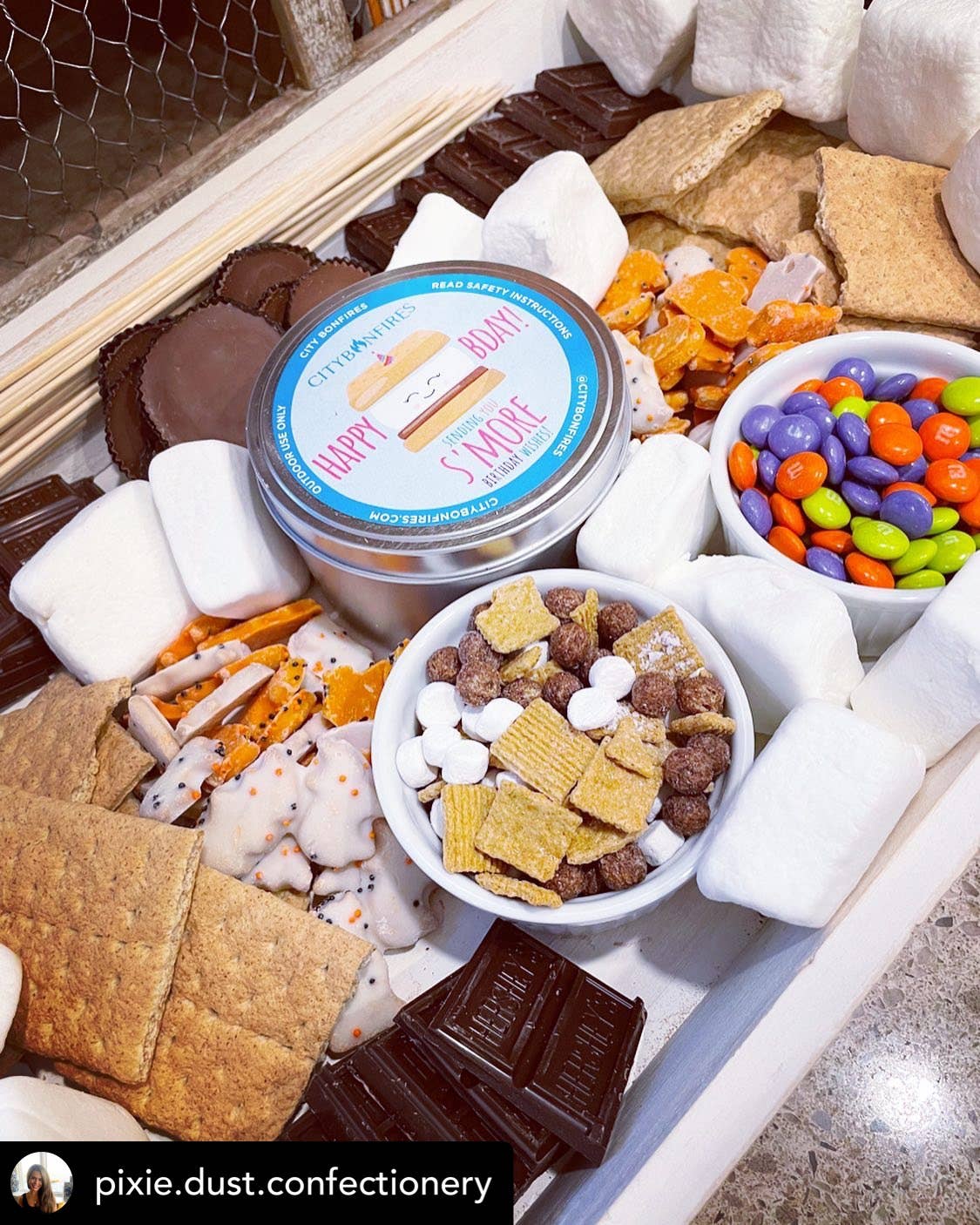 Our “Happy Birthday” City Bonfires Mini Portable Fire Pit is the perfect gift for all ages. It features a cute blue & pink label with a s’more with birthday hat and a cute birthday saying, “Sending you s’more birthday wishes!” This birthday gift comes in a gift box, sure to put a smile on anyone’s face. It's perfect for birthday gifts, outdoor activities, events, parties, and can be used anytime of the year: spring, summer, fall/autumn, and winter. Use it for camping, s'mores, hiking, picnics, beaches, date nights, patios, decks, balconies, gardens, emergency kits, & more! Compact/Easy to pack. Reusable. Recyclable. Eco-friendly. MADE IN THE USA. Burn time: 3-5 hrs. Portable heating & cooking source. Heats up to 450º F. No wood/embers/smoke. 100% non-toxic, FDA food grade soy wax. 100% biodegradable, compostable, plant-based briquettes. Easy to light/extinguish. OUTDOOR USE ONLY. 30 Year shelf life.