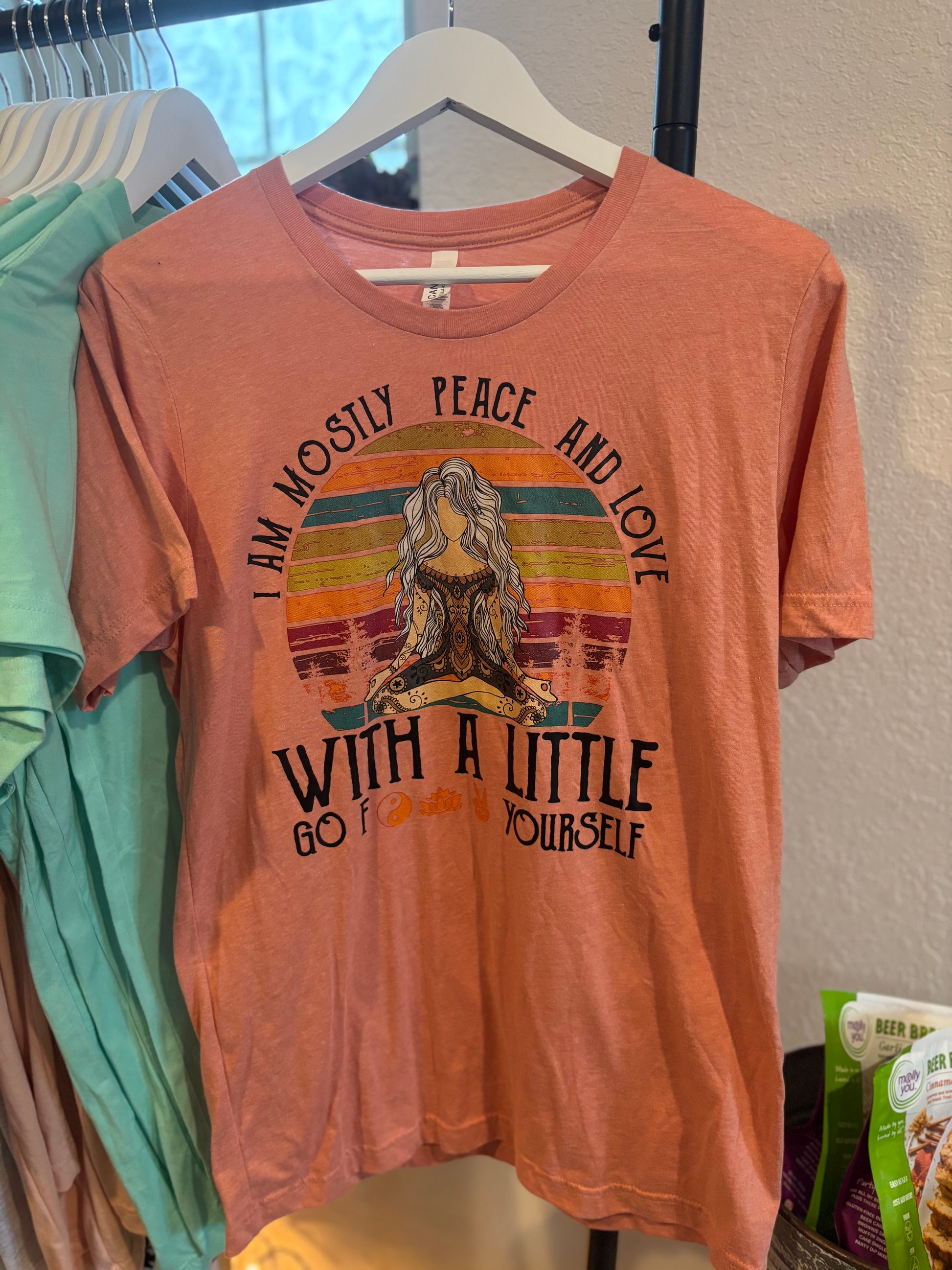Spread some good vibes and laughs with our Mostly Peace and Love Tee. With its humorous design, this shirt is sure to make people smile. Perfect for those who don't take themselves too seriously. Grab one today and spread joy wherever you go!