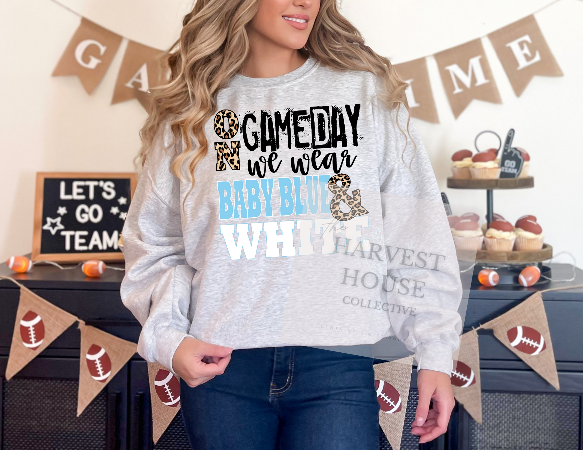 Show your team spirit with the On Gameday We Wear Baby Blue And White Shirt! Perfect for cheering on your school, this playful tee lets you proudly display your colors while having fun. Whether at the game or hanging out with friends, it’s a great way to unite and celebrate your team pride.