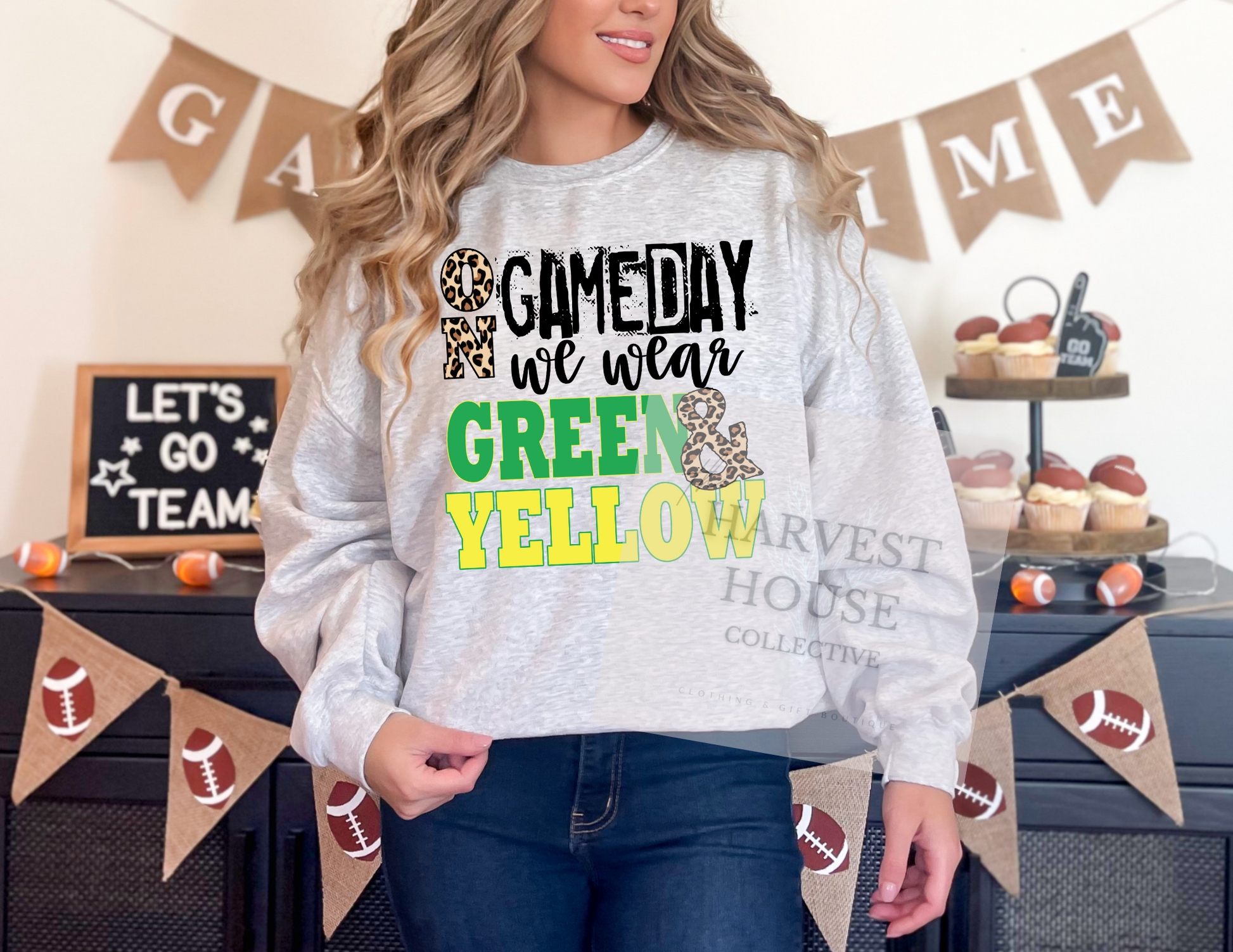 Show your team spirit with the On Gameday We Wear Green And Yellow Shirt! Perfect for cheering on your school, this playful tee lets you proudly display your colors while having fun. Whether at the game or hanging out with friends, it’s a great way to unite and celebrate your team pride.